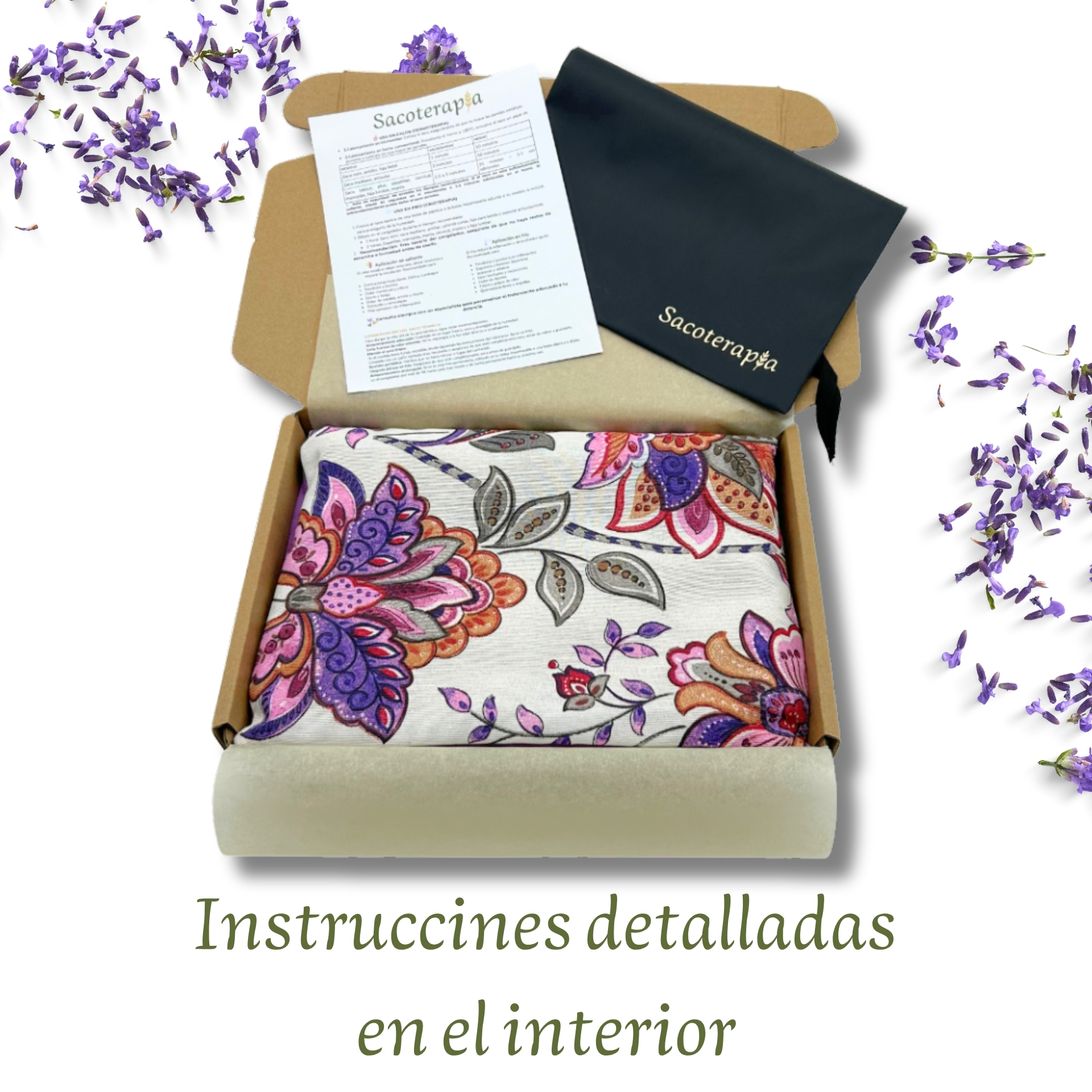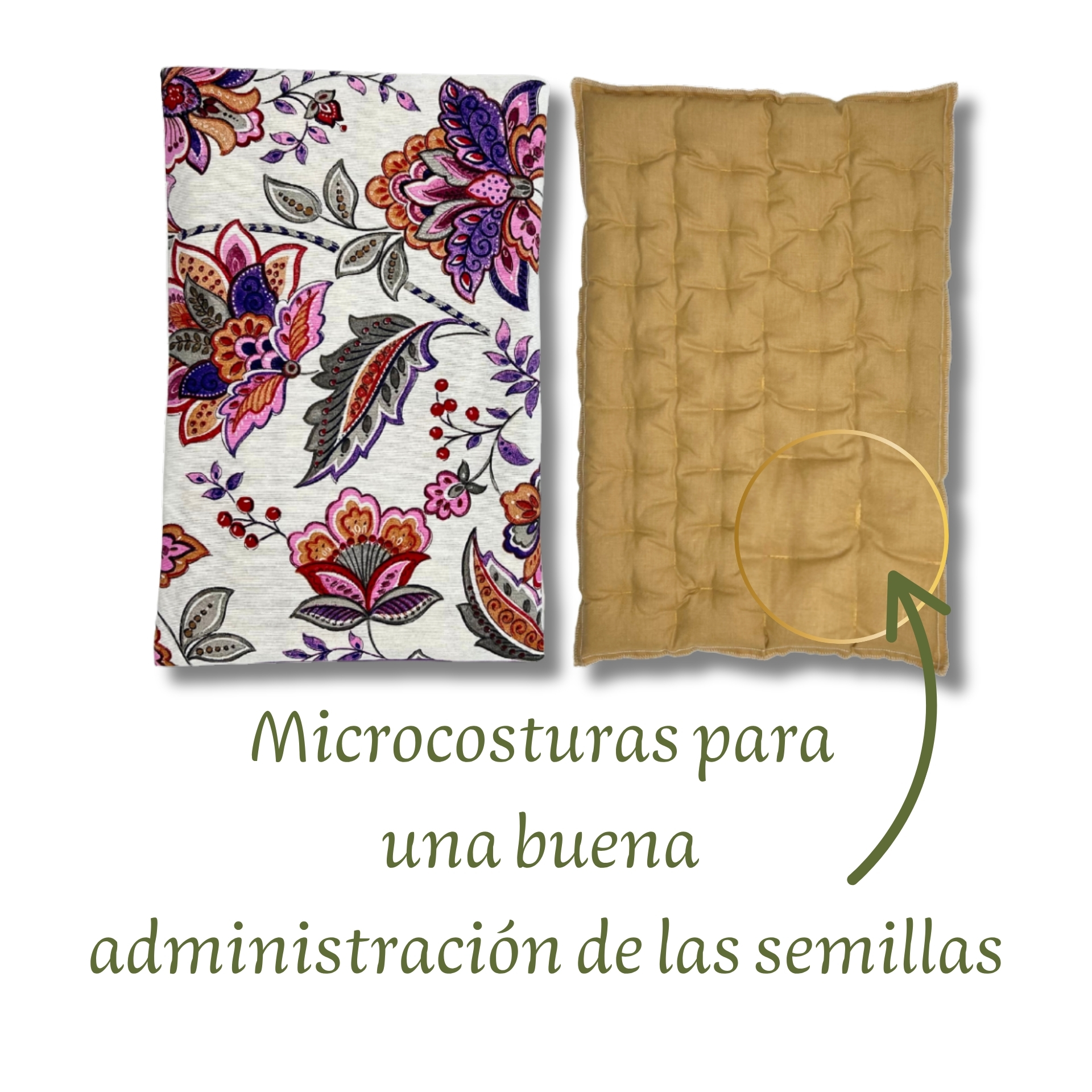 La manta está rellena de semilla de trigo (agente térmico) y una mezcla de hierbas de lavanda (relajante) y romero (antiinflamatorio), creando una experiencia de bienestar inigualable.